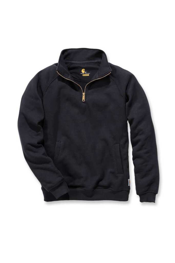 RELAXED FIT 10.5 oz/yd² - 356 gsm BLACK 50% Baumwolle/50% Polyester HEATHER GREY 70% Baumwolle/30% Polyester Mittelschweres Fleece Lange Ärmel Stehkragen Zwei Leistentaschen vorne mit Trikotfutter Vorderer Reißverschluss mit vierfacher Länge Dehnbare, elastanverstärkte Rippstrickbündchen an Ärmeln und Bund Carhartt-Label auf der unteren Vorderseite genäht